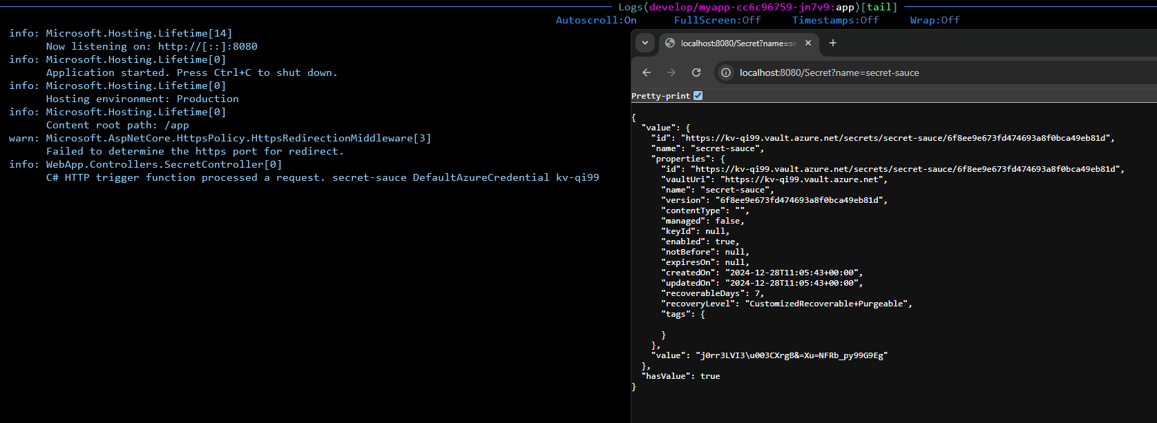 Realizando una llamada GET para consultar la información del secreto secret-sauce, podemos comprobar que la Managed Identity ha sido configurada correctamente: