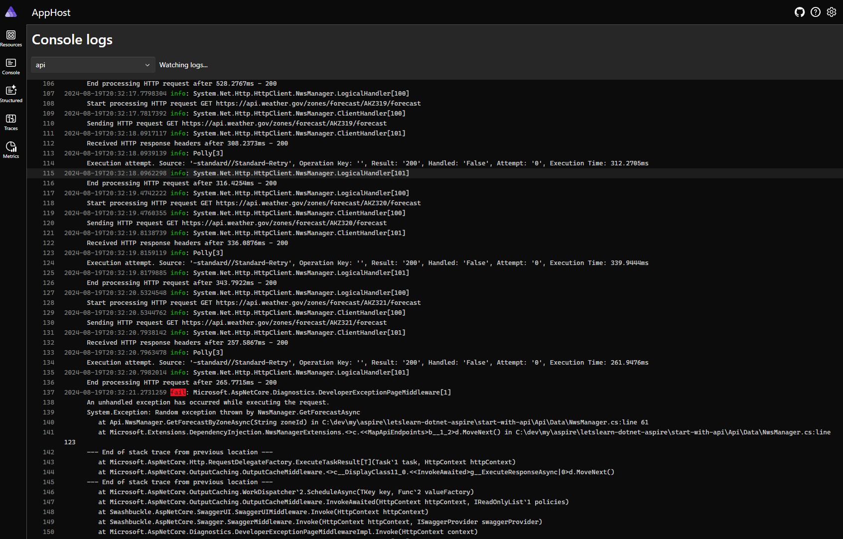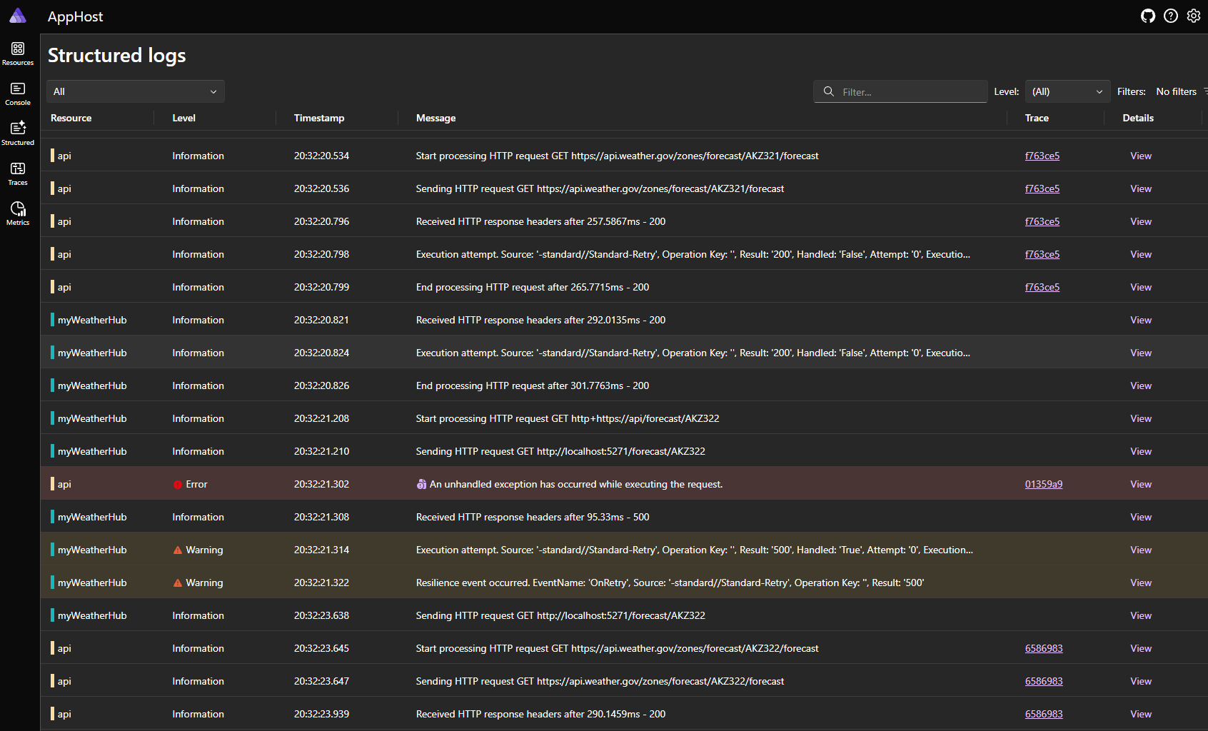 Logs estructurados (structured logs): Muestra eventos generados por OpenTelemetry: recurso relacionado, fecha, hora, nivel de log, mensaje…