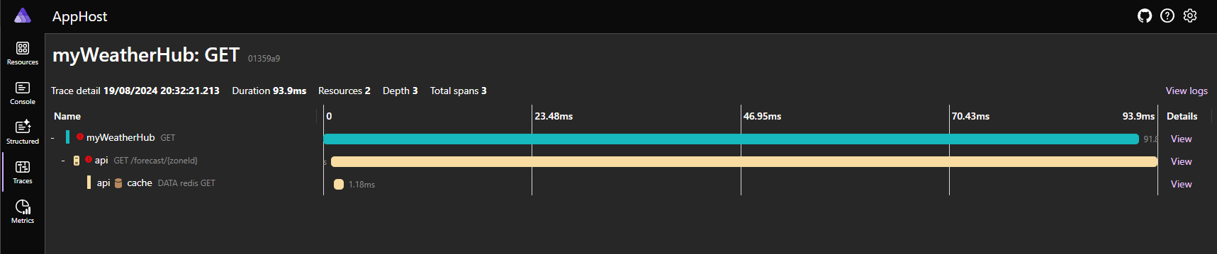 builder.Build().Run();En el ejemplo y diagrama anteriores podemos ver la definición y dependencias de una solución con tres componentes: caché, API y frontend definido como myweatherhub. Cuando iniciamos la solución, .NET Aspire se encarga de establecer los parámetros de configuración necesarios como Connection Strings o Service Bindings, ejecutar cada una de las aplicaciones y servicios en el orden necesario para que el conjunto de la solución arranque y funcione correctamente.