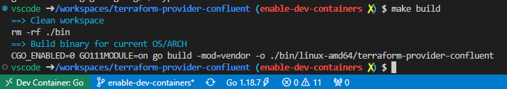 A continuación vamos a configurar un contenedor de desarrollo para el proyecto terraform provider for confluent cloud, para poder desarrollar el proyecto es necesario (puedes encontrar aqui todos los requisitos):